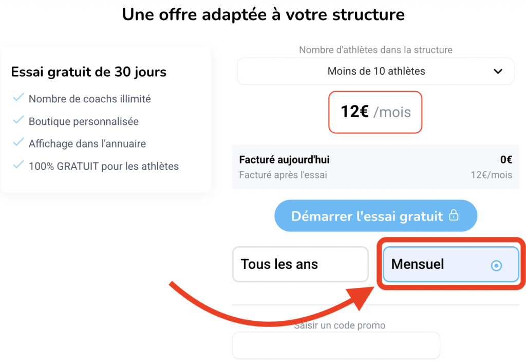 Sur iDO le coach peut choisir pour son abonnement entre un paiement annuel ou mensuel.