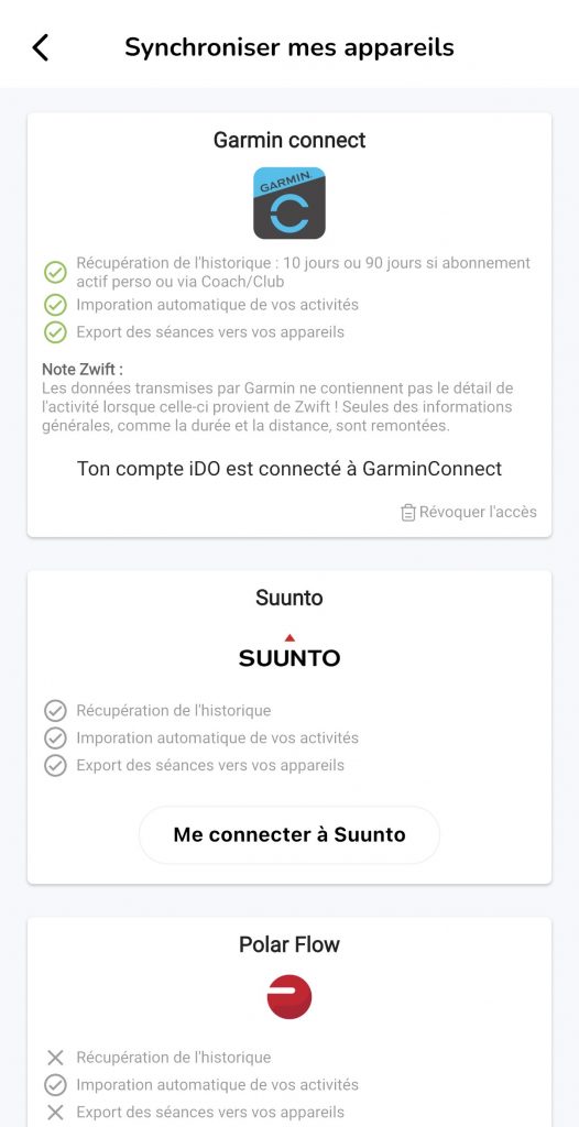 - Allez sur cette page : https://www.idosport.app/athlete/synchronisation-donnee Ou via le menu : « Mon compte » → « Objets connectés »