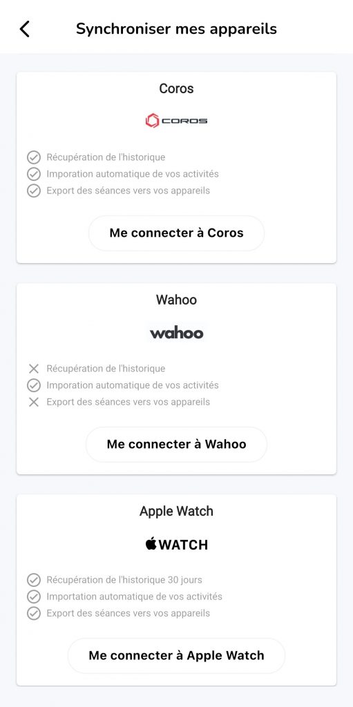 La synchronisation de votre montre (ou autre object connecté) vous permet d’importer automatiquement vos activités et d’exporter les séances planifiées vers votre montre.
